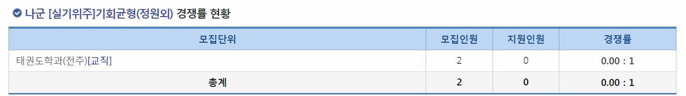 나군 [실기위주]기회균형(정원외)에서는 태권도학과(전주)의 신입생을 모집했으며, 미달이었습니다.