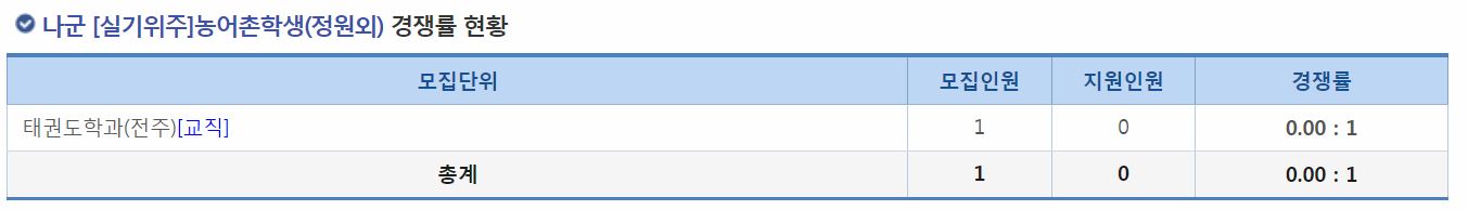나군 [실기위주] 농어촌학생(정원외) 전형에서는 태권도학과(전주)의 신입생을 모집했으며, 미달이었습니다.