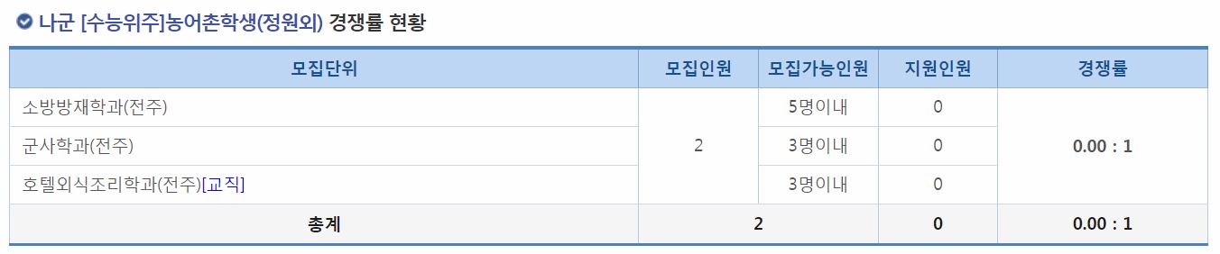 나군 [수능위주]농어촌학생(정원외) 전형은 소방방재학과(전주), 군사학과(전주), 호텔외식조리학과(전주)를 모두 통합하여 학생을 모집했으며, 미달이었습니다.