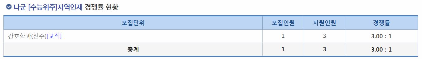 나군 [수능위주]지역인재 전형에서는 간호학과(전주)의 신입생을 모집했으며, 경쟁률은 3.00:1 이었습니다.