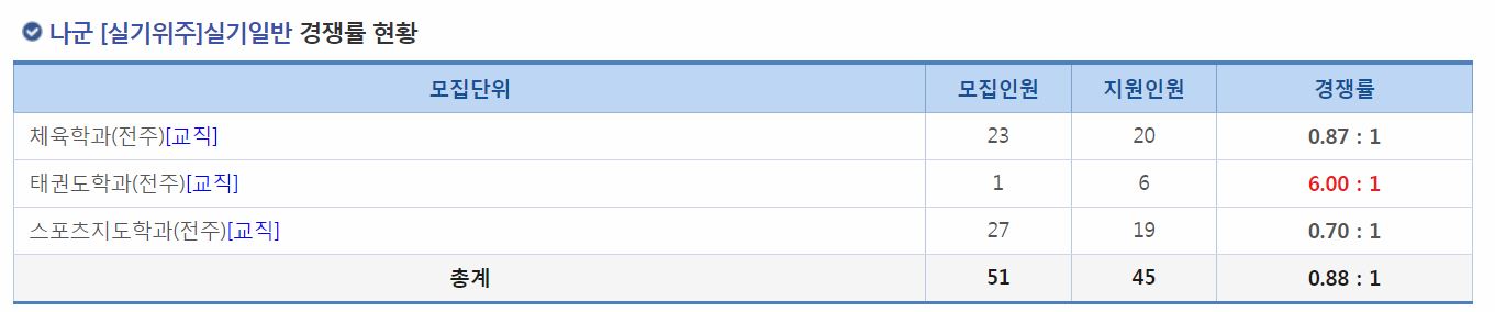 나군 [실기위주]실기일반 전형에서는 체육학과(전주), 태권도학과(전주), 스포츠지도학과(전주)의 신입생을 모집했으며, 체육학과(전주), 스포츠지도학과(전주)는 미달이었으며, 태권도학과(전주)의 경쟁률은 6.00:1 이었습니다.