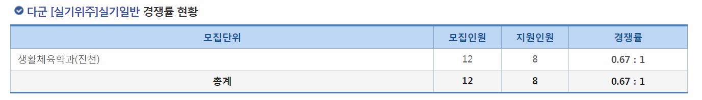 다군 [실기위주]실기일반에서는 생활체육학과(진천)의 신입생을 모집했으며, 미달이었습니다.