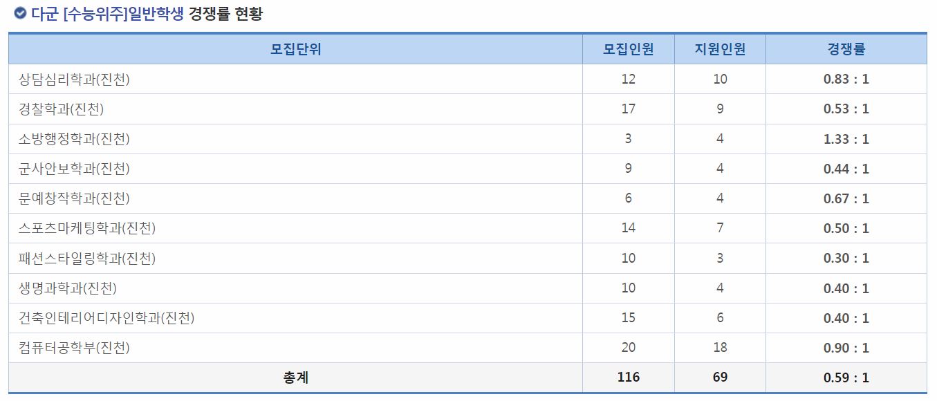 다군 [수능위주]일반학생 전형의 상담심리학과(진천), 경찰학과(진천), 군사안보학과(진천), 문예창작학과(진천), 스포츠마케팅학과(진천), 패션스타일링학과(진천), 생명과학과(진천), 건축인테리어디자인학과(진천), 컴퓨터공학부(진천)은 미달이었으며, 소방행정학과(진천)의 경쟁률은 1.33:1 이었습니다.
