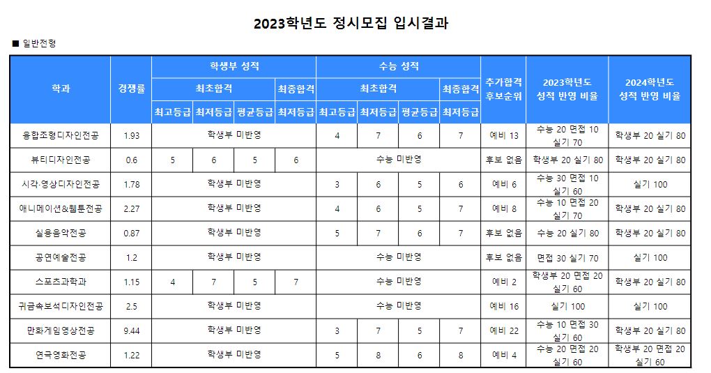 원래 3개년의 정시 등급을 올리지만, 예원예술대학교에서는 작년 입결만을 공개하고 있기에 2023학년도의 자료만을 올리도록 하겠습니다.