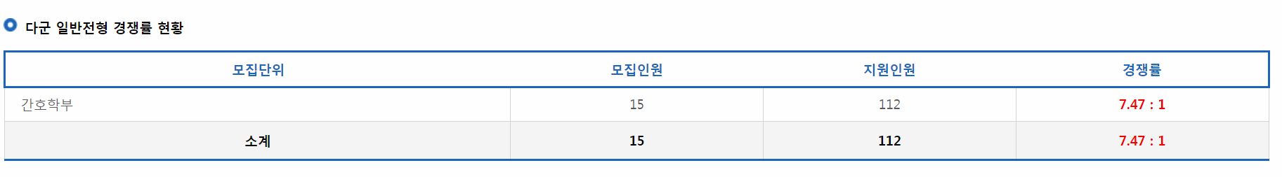 다군 일반전형에서는 간호학부의 신입생만을 모집했으며, 경쟁률은 동일하게 7.47:1 이었습니다.