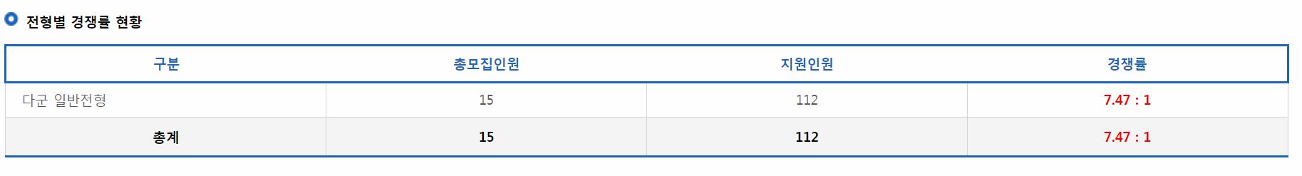 전형별로 살펴보자면, 다군 일반전형의 경쟁률은 7.47:1 이었습니다.