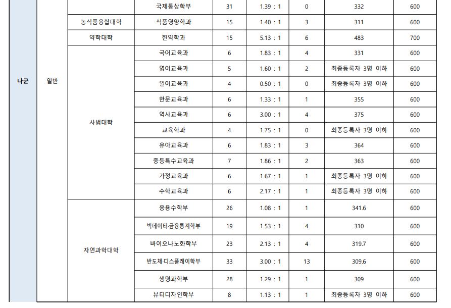 나군 : 국어교육과, 영어교육과, 일어교육과, 한문교육과, 역사교육과, 교육학과, 유아교육과, 중등특수교육과, 가정교육과, 수학교육과, 생명과학부, 뷰티디자인학부, 한의예과(자연), 한의예과(인문), 패션디자인산업학과, 가족아동복지학과, 경찰행정학과, 소방행정학과, 정보통신공학과, 전자공학과, 전자융합공학과, 디지털콘텐츠공학과, 인공지능융합학과, 스마트자동차공학과, 기계설계공학과, 건축공학과, 도시공학부, 탄소융합공학과, 치의예과(자연), 치의예과(인문), 의예과, 작업치료학과, 국방기술학과