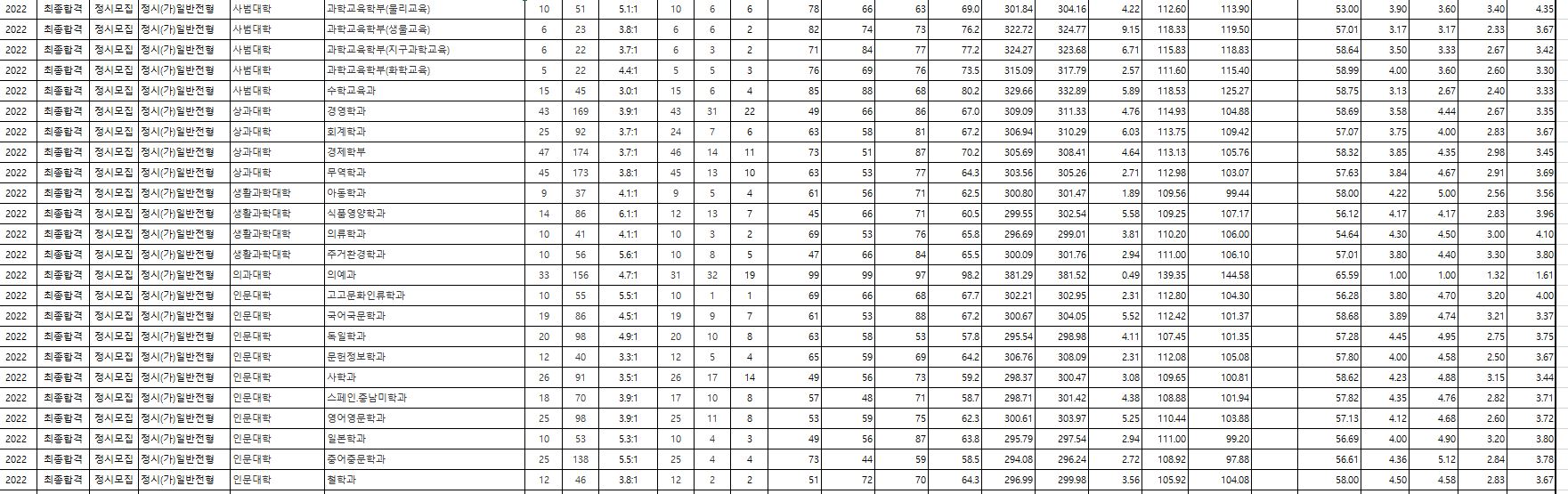 가군 : 스마트팜학과, 공공인재학부, 농경제유통학부(농업경제학), 농경제유통학부(식품유통학), 농생물학과, 동물생명공학과, 동물자원과학과, 목재응용과학과, 산림환경과학과, 생물산업기계공학과, 생물환경화학과, 식품공학과, 원예학과, 작물생명과학과, 조경학과, 지역건설공학과, 과학교육학부(물리교육), 과학교육학부(생물교육), 과학교육학부(지구과학교육), 과학교육학부(화학교육), 교육학과, 국어교육과, 독어교육과, 수학교육과, 역사교육과, 영어교육과, 윤리교육과, 일반사회교육과, 지리교육과, 경영학과, 경제학부, 무역학과, 회계학과, 식품영양학과, 아동학과, 의류학과, 주거환경학과, 의예과, 고고문화인류학과, 국어국문학과, 독일학과, 문헌정보학과, 사학과, 스페인중남미학과, 영어영문학과, 일본학과, 중어중문학과, 철학과, 프랑스아프리카학과, 과학학과, 물리학과, 반도체과학기술학과, 생명과학부(분자생물학), 생명과학부(생명과학), 수학과, 지구환경과학과, 통계학과, 화학과, 치의예과, 의예과(지역인재), 치의예과(지역인재), 농생물학과(농어촌학생), 목재응용과학과(농어촌학생), 경영학과(농어촌학생), 경제학부(농어촌학생), 무역학과(농어촌학생), 사학과(농어촌학생), 영어교육과(기회균형선발), 과학교육학부(물리교육)(기회균형선발)