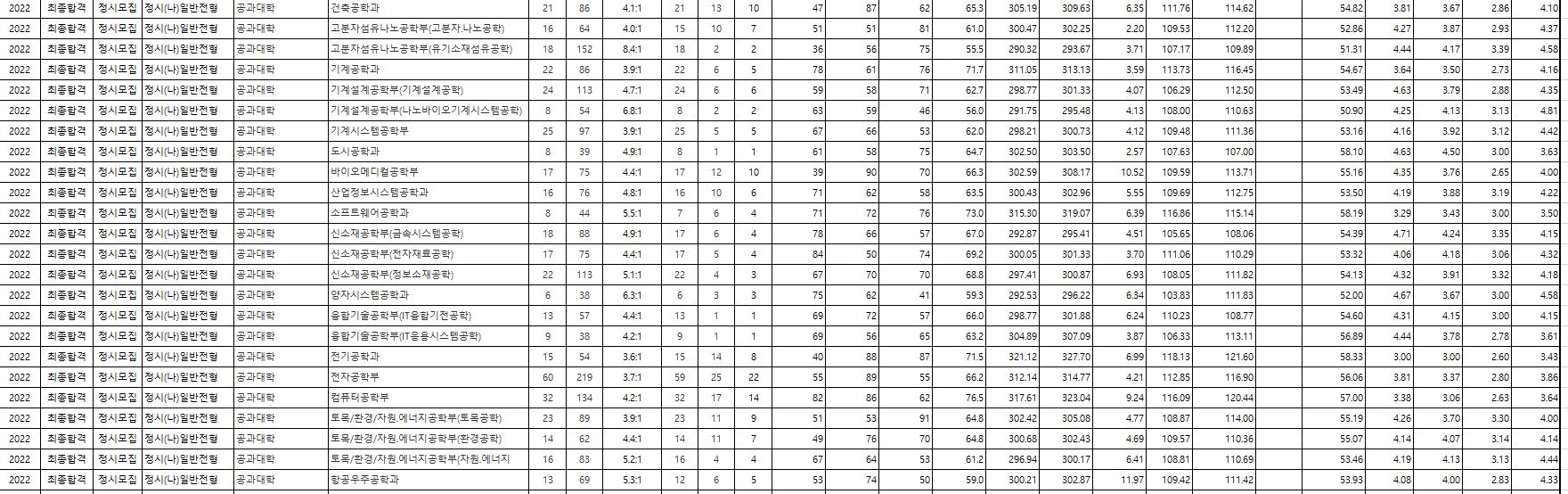 나군 : 간호학과, 건축공학과, 고분자나노공학과, 기계공학과, 기계설계공학부(기계설계공학), 기게설계공학부(나노바이오기계시스템공학), 기계시스템공학부, 도시공학과, 바이오메디컬공학부, 산업정보시스템공학과, 소프트웨어공학과, 신소재공학부(금속시스템공학), 신소재공학부(전자재료공학), 신소재공학부(정보소재공학), 양자시스템공학과, 유기소재섬유공학과, 융합기술공학부(IT융합기전공학), 융합기술공학부(IT응용시스템공학), 전기공학과, 전자공학부, 컴퓨터인공지능학부, 토목/환경/자원에너지공학부(자원에너지), 토목/환경/자원에너지공학부(토목공학), 토목/환경/자원에너지공학부(환경공학), 항공우주공학과, 화학공학부, 국제이공학부, 체육교육과, 미디어커뮤니케이션학과, 사회복지학과, 사회학과, 심리학과, 정치외교학과, 행정학과, 수의예과, 약학과, 무용학과(발레), 무용학과(한국무용), 무용학과(현대무용), 한국음악학과(현악), 스포츠과학과, 생명공학부, 생태조경디자인학과, 한약자원학과, 간호학과(지역인재기회균형선발), 도시공학과(기회균형선발), 전기공학과(기회균형선발), 국제이공학부(기회균형선발), 생명공학부(기회균형선발), 한약자원학과(기회균형선발), 바이오메디컬공학부(농어촌학생), 컴퓨터인공지능학부(농어촌학생), 생명자원융합학과(만학도)