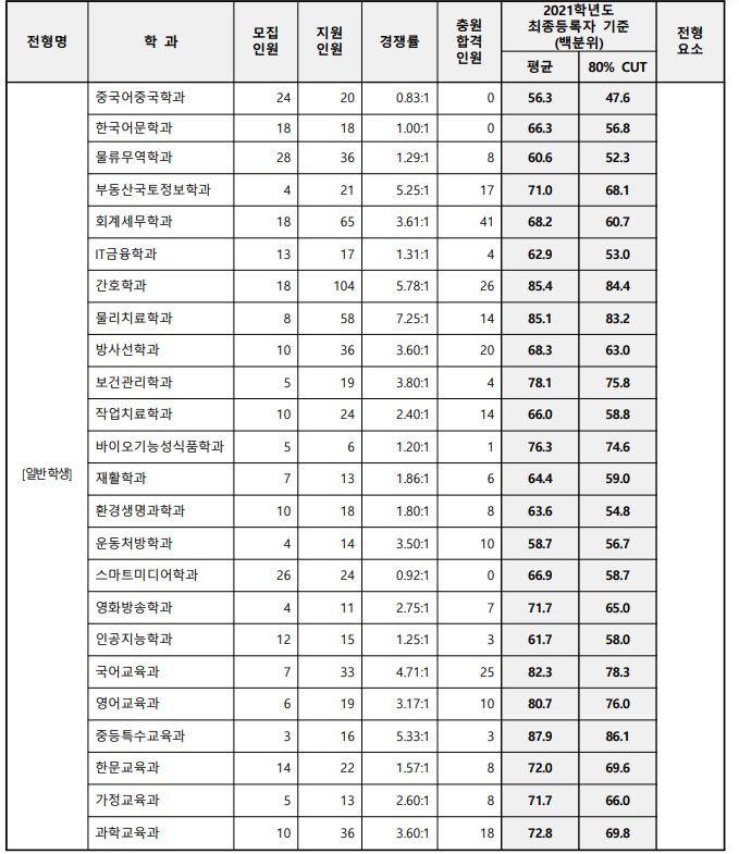 이 중 중국어중국학과, 스마트미디어학과는 미달이었으며, 한국어문화학과는 모집인원과 지원인원이 같았습니다. 이외의 학과 중 가장 경쟁률이 높았던 학과는 물리치료학과(7.25:1), 간호학과(5.78:1), 중등특수교육과(5.33:1) 순이었습니다.