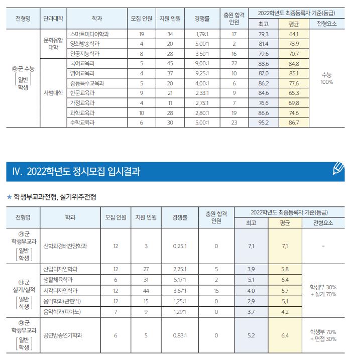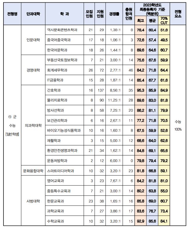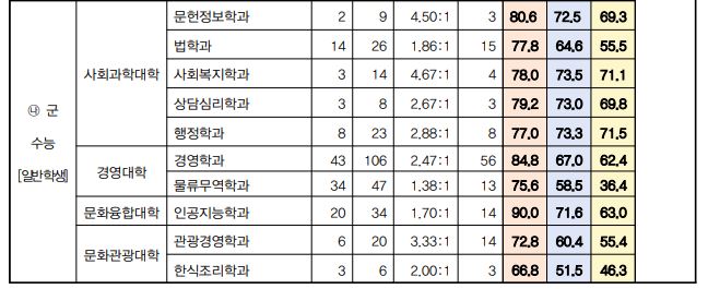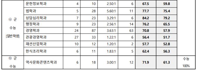 나군 : 문헌정보학과, 법학과, 상담심리학과, 행정학과, 경영학과, 관광경영학과, 패션산업학과, 한식조리학과, 산업디자인학과(실기실적), 생활체육학과(실기실적), 시각디자인학과(실기실적), 음악학과(관현악)(실기실적), 음악학과(피아노)(실기실적)