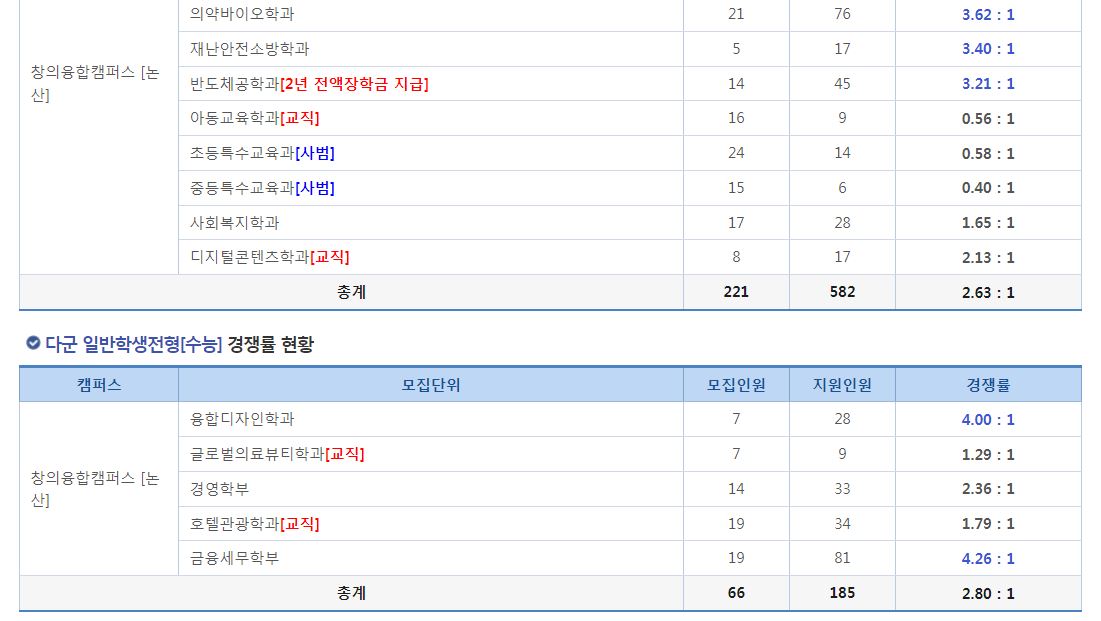 다군 : 융합디자인학과, 글로벌의료뷰티학과, 경영학부, 호텔관광학과, 금융세무학부