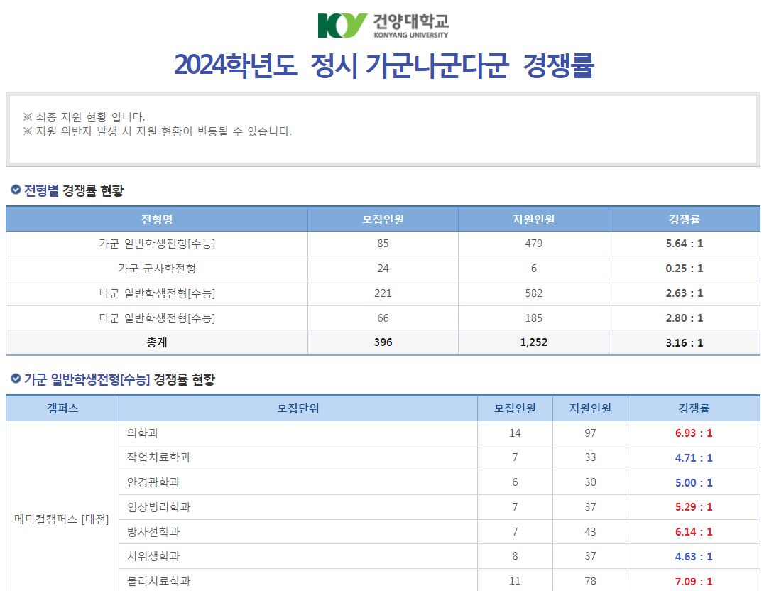 2024학년도 정시 모집이 마감되었습니다. 건양대학교의 최종 경쟁률에 대해 포스팅해보도록 하겠습니다.