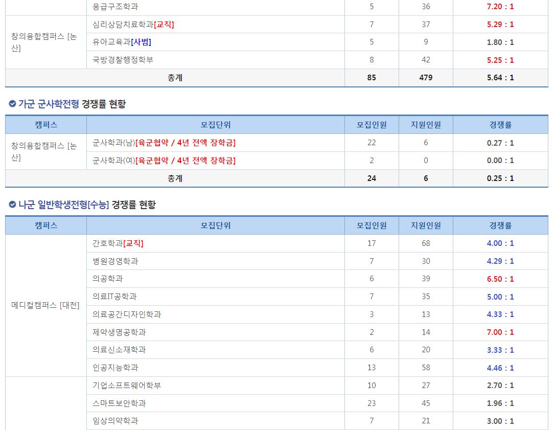 전형별로 보자면 가군 군사학전형은 미달이었습니다. 가장 경쟁률이 높았던 전형은 가군 일반학생전형[수능]이었습니다.