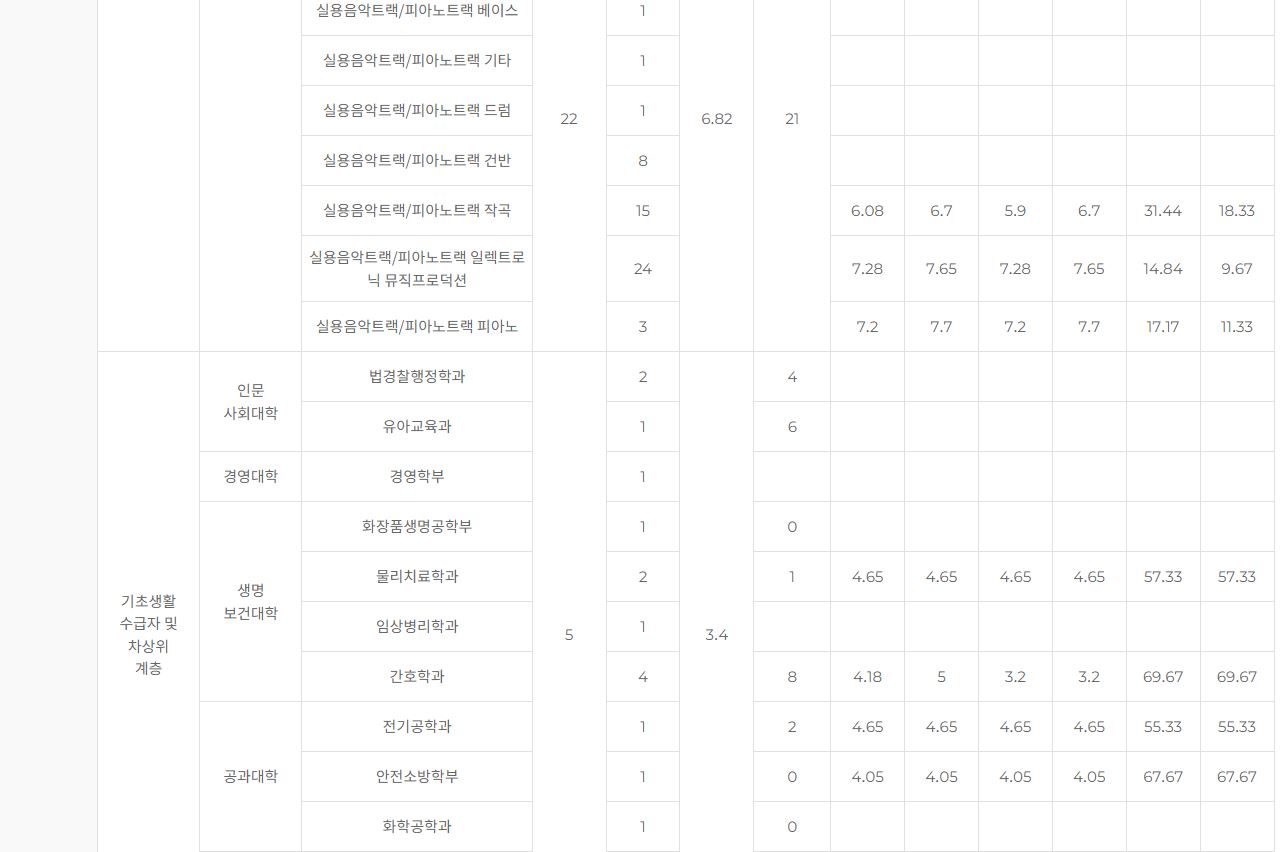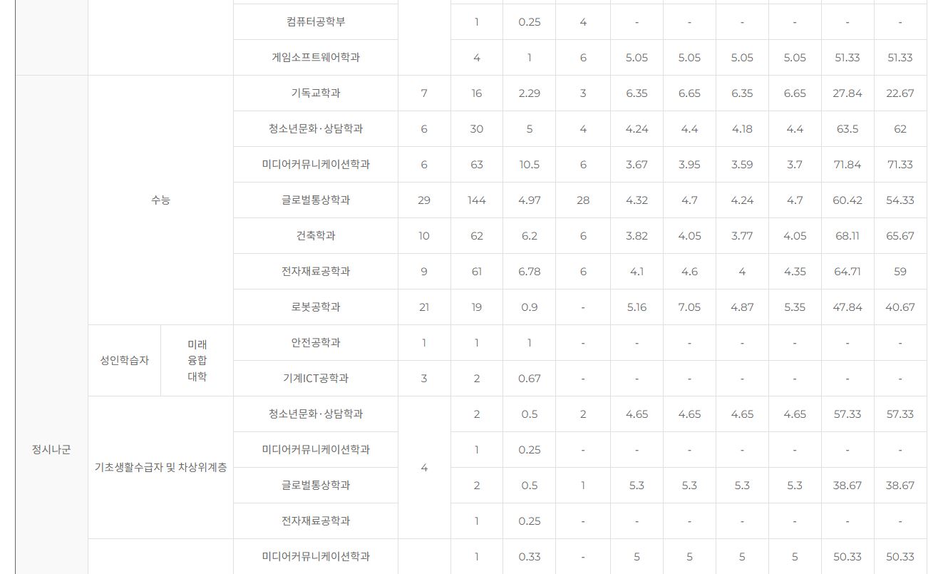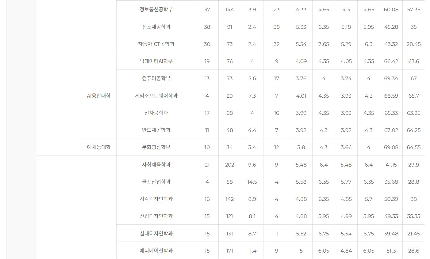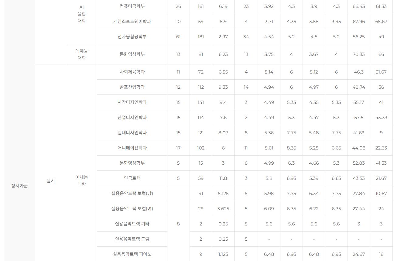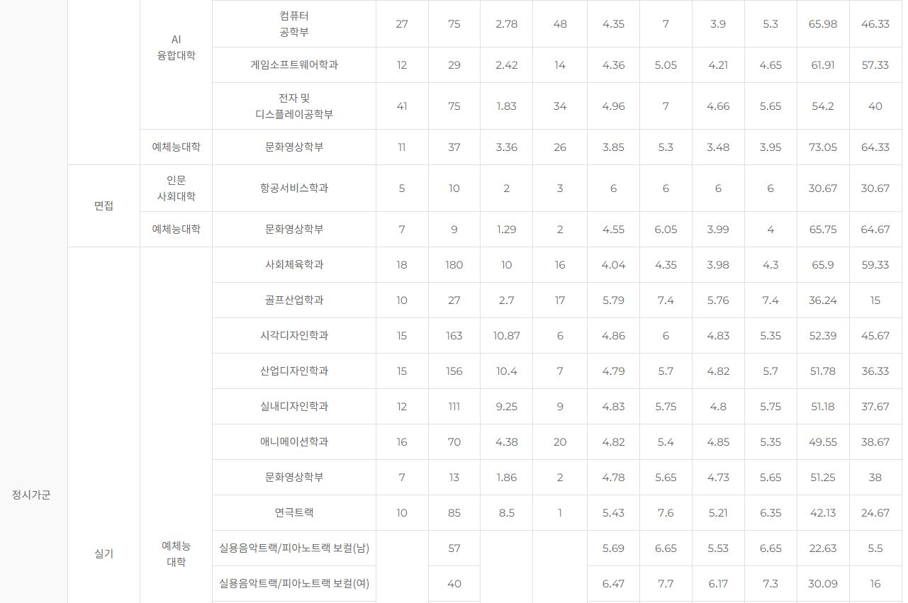 이 중 신소재공학과, 자동차ICT공학과, 실용음악트랙 기타, 실용음악트랙 드럼, 기초생활수급자 및 차상위계층 전형, 농어촌학생 전형, 특성화고교졸업자(게임소프트웨어학과 제외) 전형은 모두 미달이었으며, 성인학습자 전형의 기계ICT공학과 역시 미달, 안전공학과는 지원인원과 모집인원이 같았습니다. 이외의 학과 중 가장 경쟁률이 높았던 학과는 실용음악트랙 일렉트로닉 뮤직프로덕션(16.5:1), 연극트랙(11.8:1), 시각디자인학과(9.4:1) 순이었습니다.