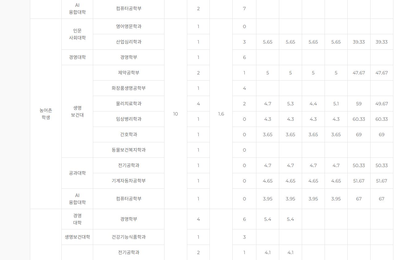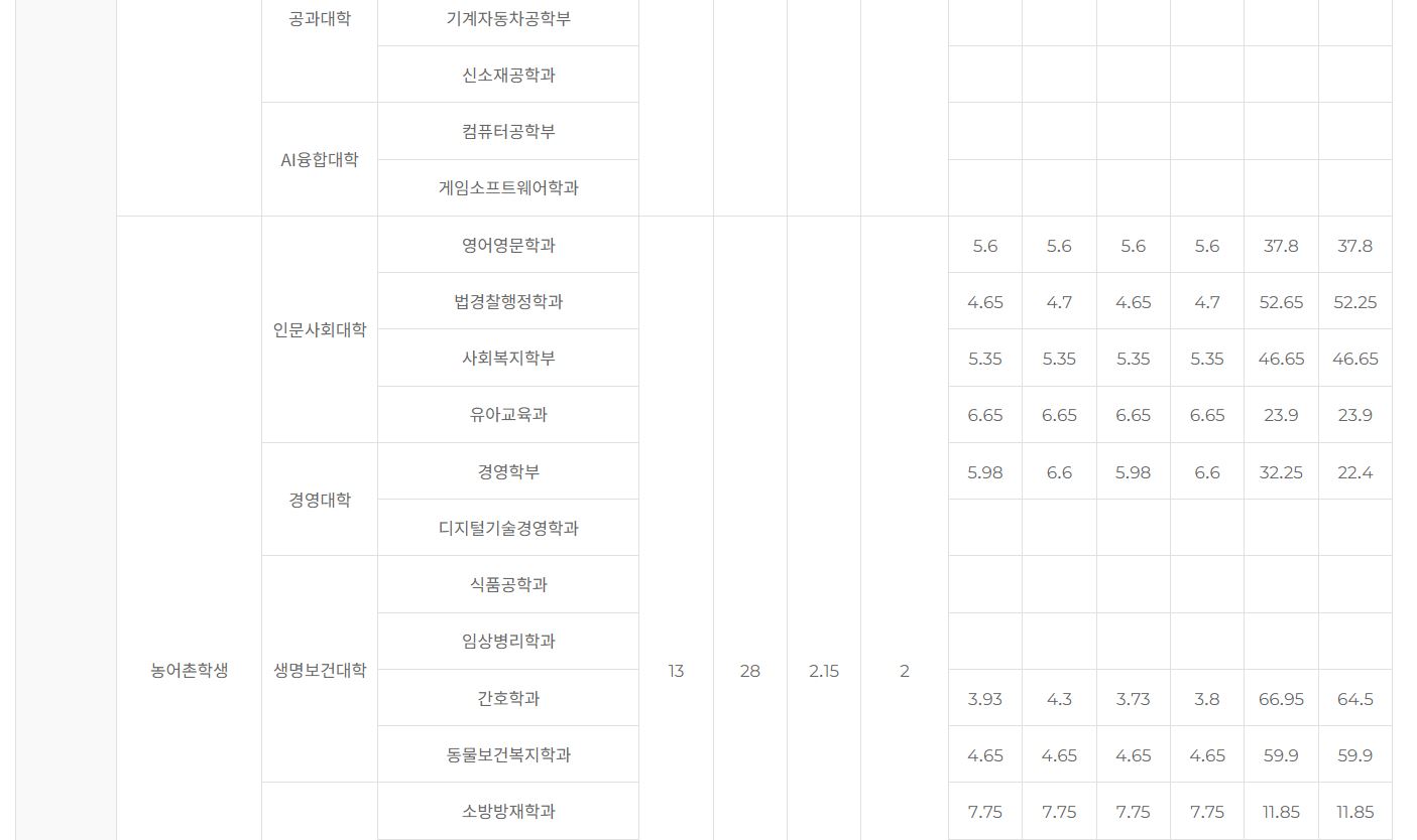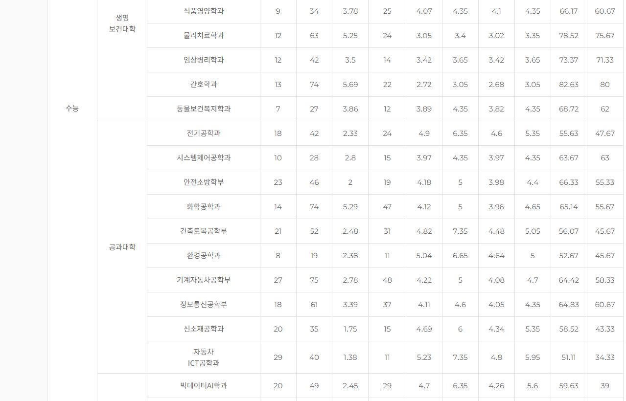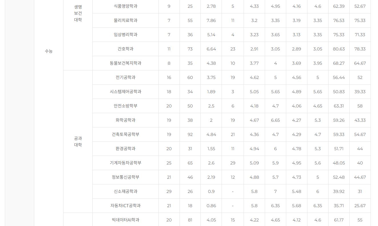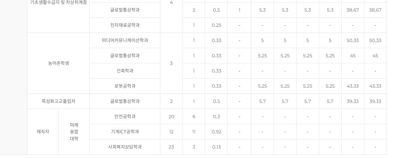 이 중 신소재공학과, 자동차ICT공학과, 실용음악트랙 기타, 실용음악트랙 드럼, 기초생활수급자 및 차상위계층 전형, 농어촌학생 전형, 특성화고교졸업자(게임소프트웨어학과 제외) 전형은 모두 미달이었으며, 성인학습자 전형의 기계ICT공학과 역시 미달, 안전공학과는 지원인원과 모집인원이 같았습니다. 이외의 학과 중 가장 경쟁률이 높았던 학과는 실용음악트랙 일렉트로닉 뮤직프로덕션(16.5:1), 연극트랙(11.8:1), 시각디자인학과(9.4:1) 순이었습니다.