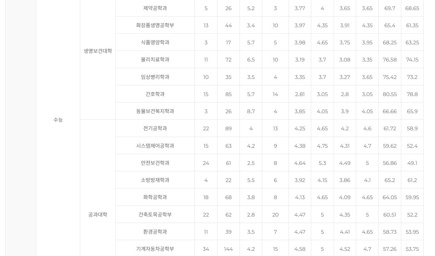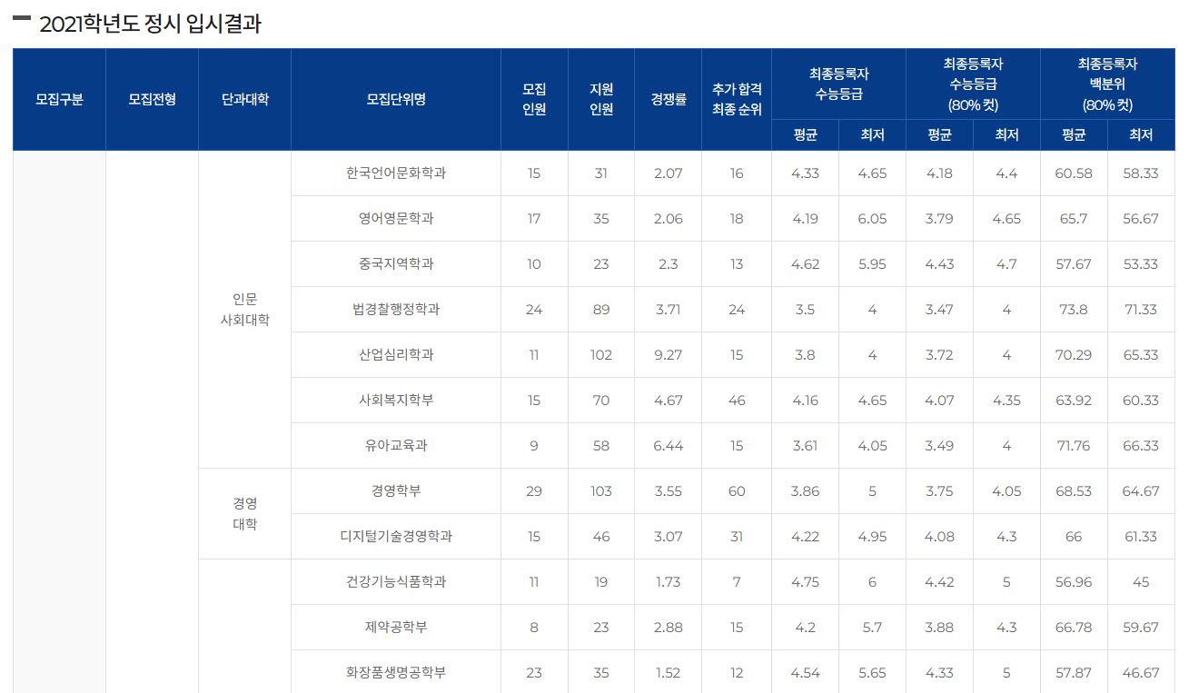 가군 : 한국언어문화학과, 영어영문학과, 중국지역학과, 법경찰행정학과, 산업심리학과, 사회복지학부, 유아교육과, 경영학부, 디지털기술경영학과, 건강기능식품학과, 제약공학과, 화장품생명공학부, 식품영양학과, 물리치료학과, 임상병리학과, 간호학과, 동물보건복지학과, 전기공학과, 시스템제어공학과, 안전소방학부, 화학공학과, 건축토목공학부, 환경공학과, 기계자동차공학부, 정보통신공학부, 신소재공학과, 자동차ICT공학과, 빅데이터AI학과, 컴퓨터공학부, 게임소프트웨어학과, 전자및디스플레이공학부, 문화영상학부, 항공서비스학과, 문화영상학부, 사회체육학과, 골프산업학과, 시각디자인학과, 산업디자인학과, 실내디자인학과, 애니메이션학과, 문화영상학부, 연극트랙, 실용음악트랙/피아노트랙 보컬(남), 실용음악트랙/피아노트랙 보컬(여), 실용음악트랙/피아노트랙 베이스, 실용음악트랙/피아노트랙 기타, 실용음악트랙/피아노트랙 드럼, 실용음악트랙/피아노트랙 건반, 실용음악트랙/피아노트랙 작곡, 실용음악트랙/피아노트랙 일렉트로닉 뮤직프로덕션, 실용음악트랙/피아노트랙 피아노