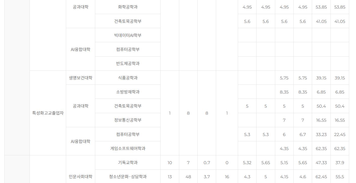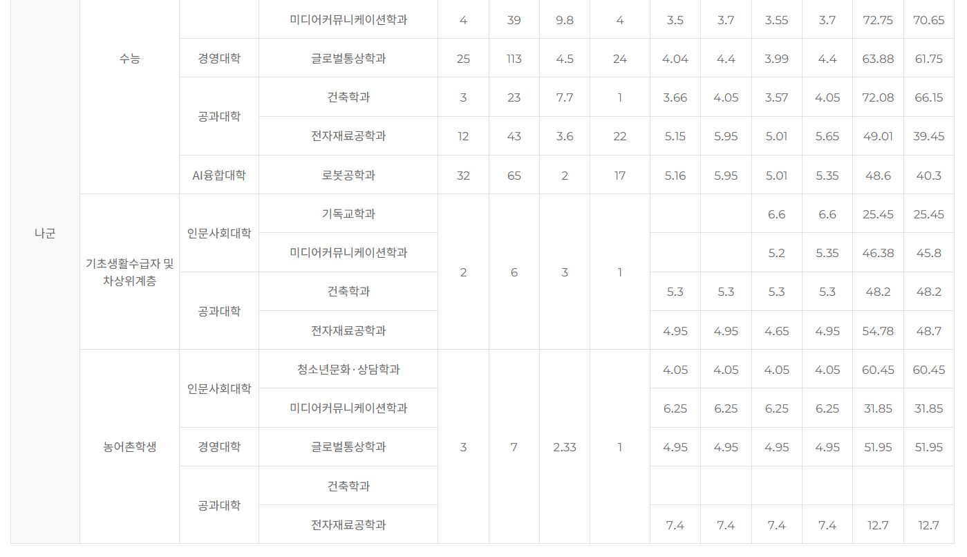 나군 : 기독교학과, 청소년문화상담학과, 글로벌통상학과, 건축학과, 전자재료공학과, 로봇공학과