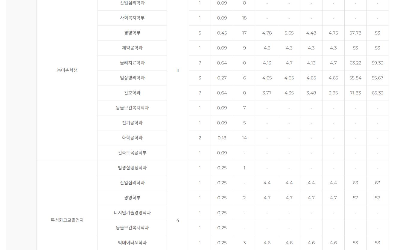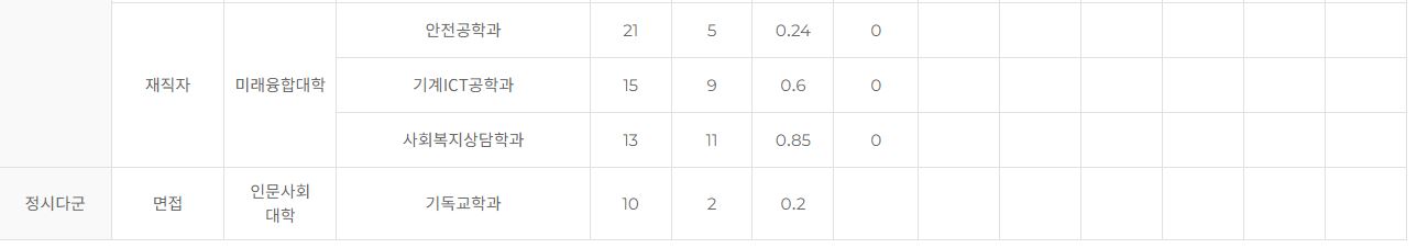 이 중 재직자전형의 모든 학과(안전공학과, 기계ICT공학과, 사회복지상담학과), 기독교학과는 미달이었으며, 이외의 학과 중 가장 경쟁률이 높았던 학과는 시각디자인학과(10.87:1), 산업디자인학과(10.4:1), 실내디자인학과(9.25:1) 순이었습니다.
