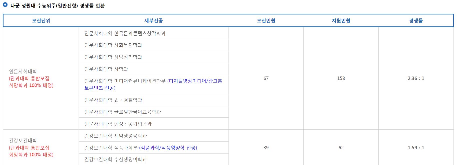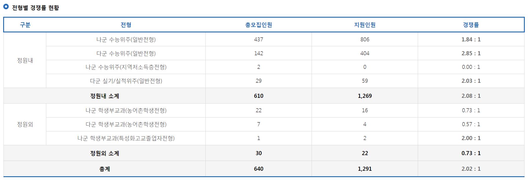 다군 정원내 수능위주(일반전형) 경쟁률 현황