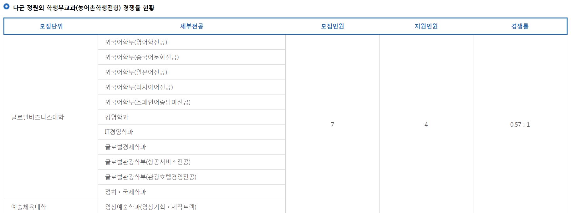 다군 정원외 학생부교과(농어촌학생전형) 경쟁률 현황