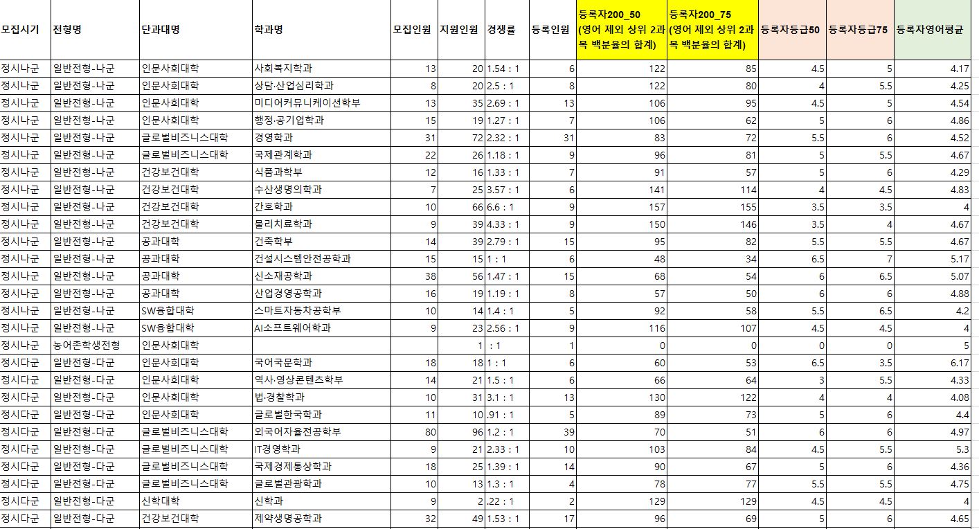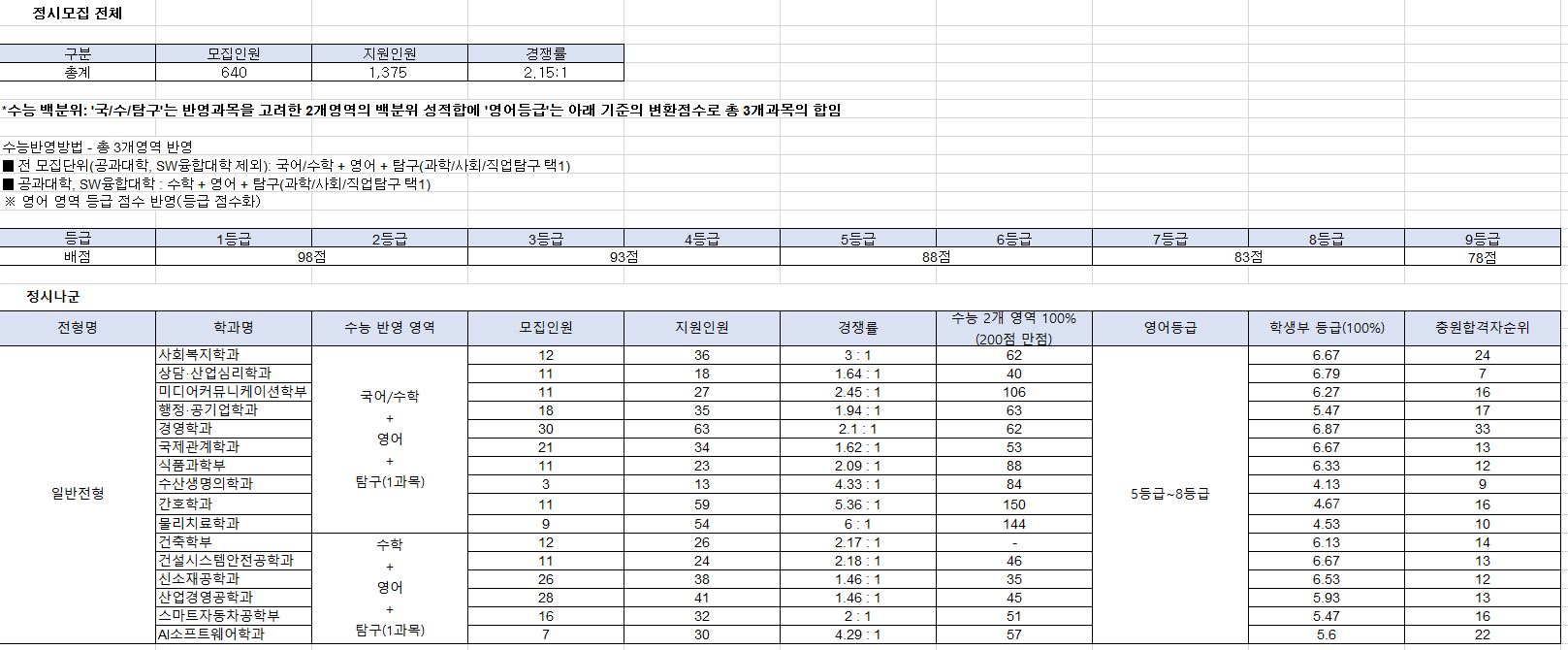 나군 : 사회복지학과, 상담 산업심리학과, 미디어커뮤니케이션학부, 행정 공기업학과, 경영학과, 국제관계학과, 식품과학부, 수산생명의학과, 간호학과, 물리치료학과, 건축학부, 건설시스템안전공학과, 신소재공학과, 산업경영공학과, 스마트자동차공학부, AI소프트웨어학과