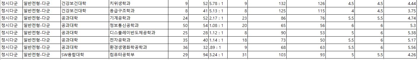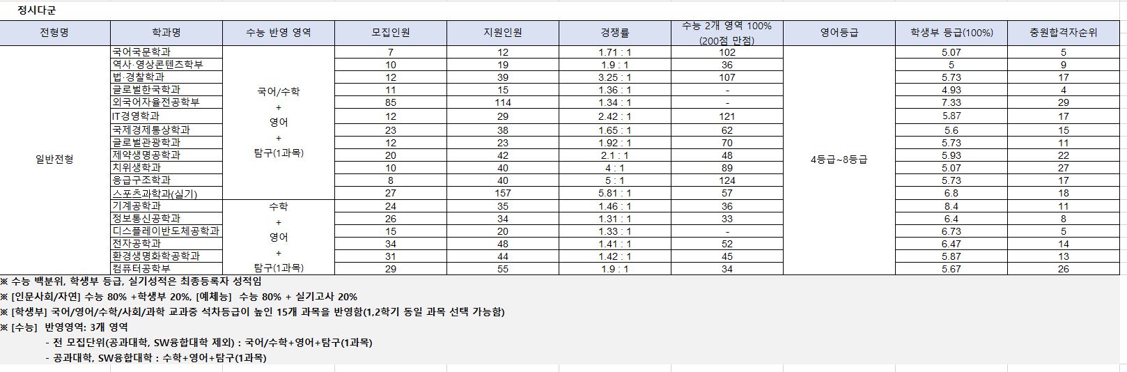 다군 : 국어국문학과, 역사 영상콘텐츠학부, 법 경찰학과, 글로벌한국학과, 외국어자율전공학부, IT경영학과, 국제경제통상학과, 글로벌관광학과, 제약생명공학과, 치위생학과, 응급구조학과, 스포츠과학과(실기), 기계공학과, 정보통신공학과, 디스플레이반도체공학과, 전자공학과, 환경생명화학공학과, 컴퓨터공학부