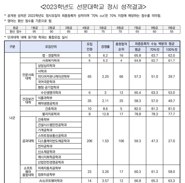 나군 : 법 경찰학과, 사회복지학과, 인문사회대학, 수산생명의학과, 건강보건대학, 간호학과, 물리치료학과, 공과대학, 소프트웨어융합대학, AI소프트웨어학과