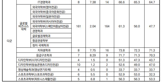 다군 : IT경영학과, 글로벌비즈니스대학, 치위생학과, 응급구조학과, 디자인학부(시각디자인전공), 디자인학부(방송콘텐츠디자인전공), 영상예술학과(영상연기트랙), 스포츠과학부(스포츠과학전공), 스포츠과학부(피트니스재활전공)