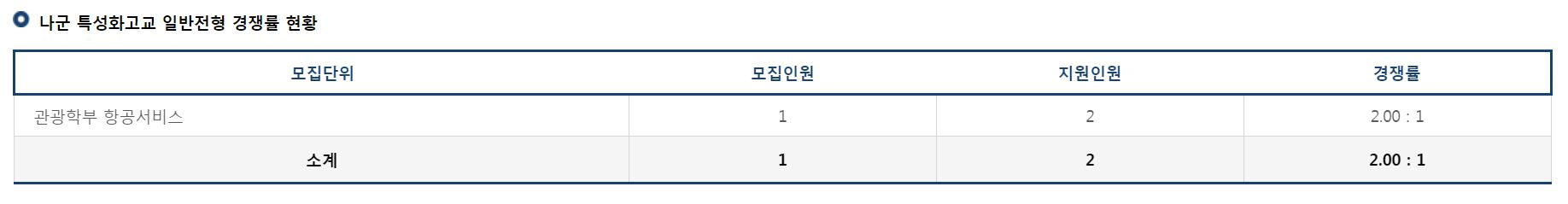 나군 특성화고교 일반전형에서는 관광학부 항공서비스학부의 신입생을 모집했으며, 경쟁률은 2.00:1 이었습니다.