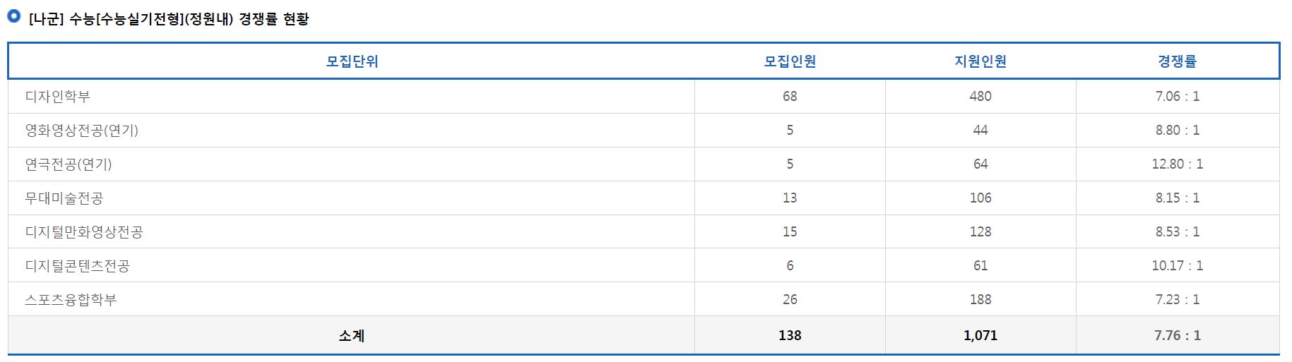 [나군] 수능[수능실기전형](정원내) 전형에서 가장 경쟁률이 높았던 학과는 연극전공(연기)(12.80:1), 디지털콘텐츠전공(10.17:1), 영화영상전공(연기)(8.80:1) 순이었습니다.