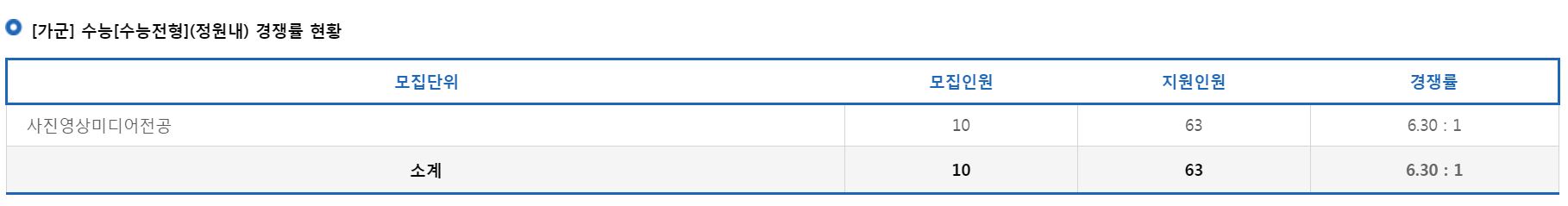 [가군] 수능[수능전형](정원내) 전형에서는 사진영상미디어전공의 신입생을 모집했으며, 경쟁률은 6.30:1 이었습니다.