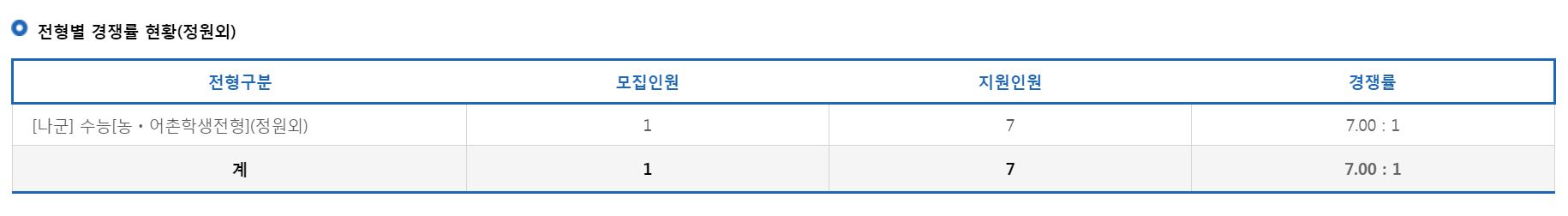 정원외 전형에서는 [나군] 수능(농어촌학생전형)(정원외)의 신입생을 모집했으며, 경쟁률은 7.00:1 이었습니다.