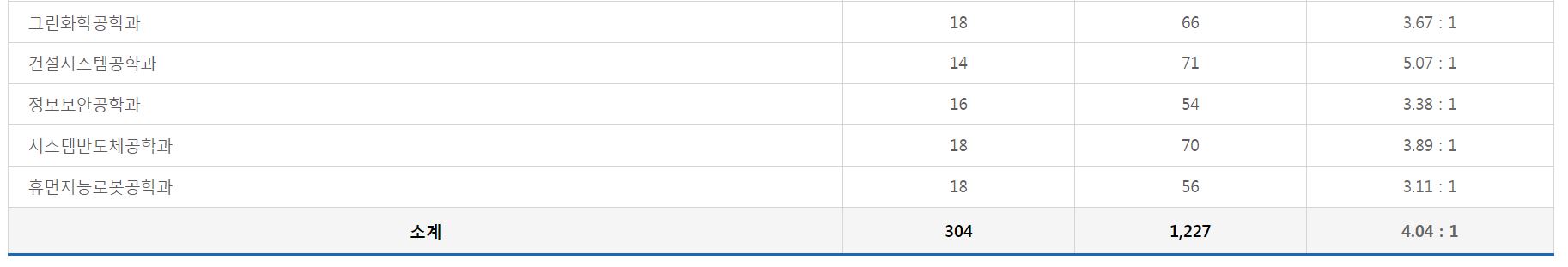 [나군] 수능[수능전형](정원내) 전형에서 가장 경쟁률이 높았던 학과는 AR/VR미디어디자인전공(7..40:1), 그린스마트시티학과(5.80:1), 건설시스템공학과(5.07:1) 순이었습니다.