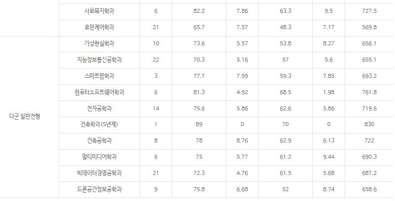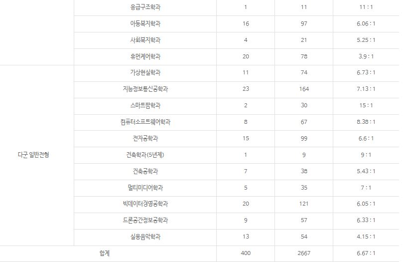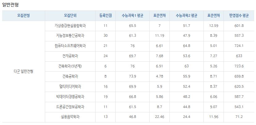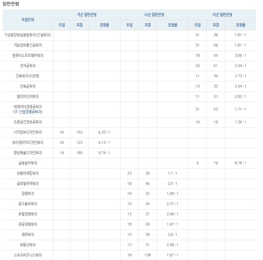 다군 : 가상현실학과, 지능정보통신공학과, 스마트팜학과, 컴퓨터소프트웨어학과, 전자공학과, 건축학과(5년제), 건축공학과, 멀티미디어학과, 빅데이터경영공학과, 드론공간정보공학과, 실용음악학과