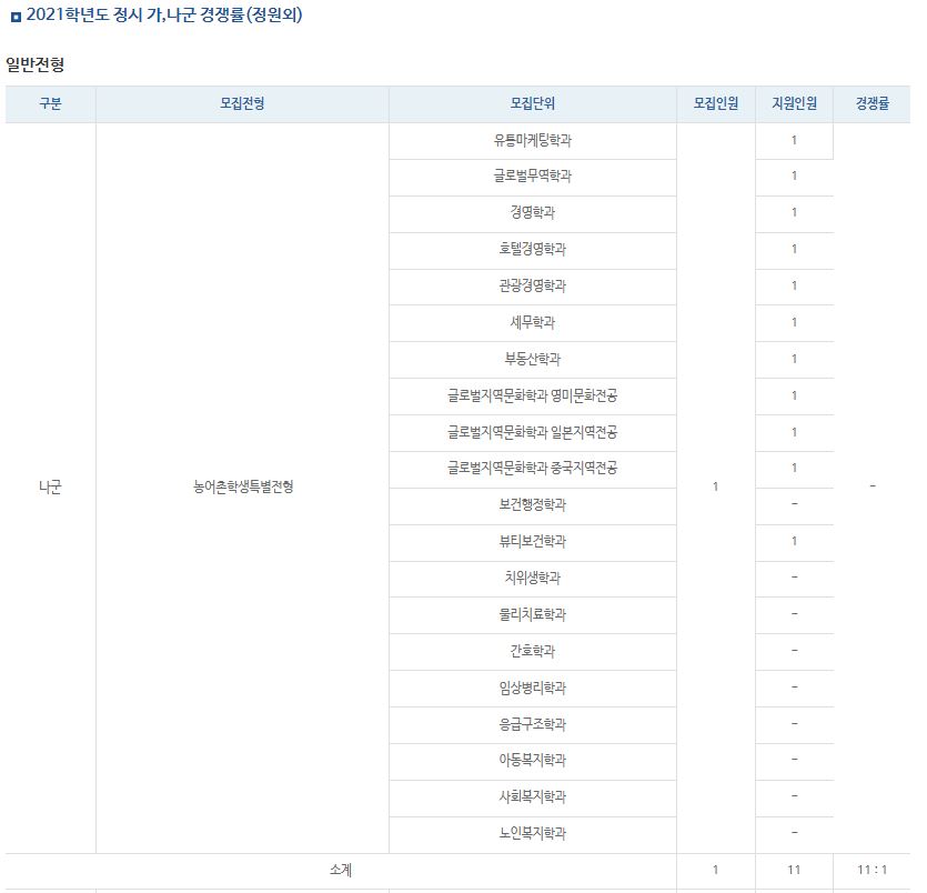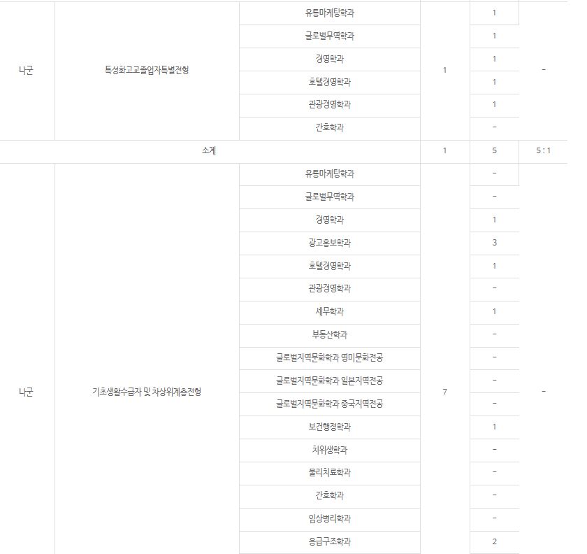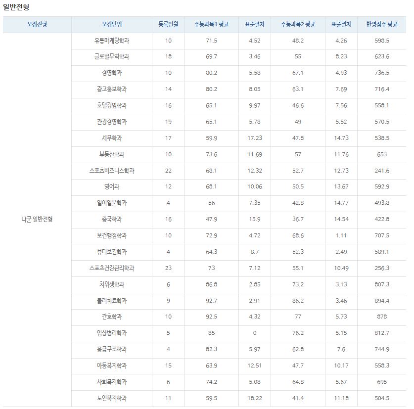 나군 : 유통마케팅학과, 글로벌무역학과, 경영학과, 광고홍보학과, 호텔경영학과, 관광경영학과, 세무학과, 부동산학과, 스포츠비즈니스학과, 영어과, 일어일문학과, 중국학과, 보건행정학과, 뷰티보건학과, 스포츠건강관리학과, 치위생학과, 물리치료학과, 간호학과, 임상병리학과, 응급구조학과, 아동복지학과, 사회복지학과, 노인복지학과