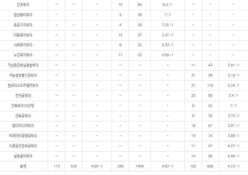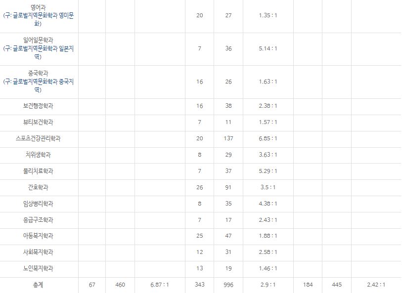 가장 경쟁률이 높았던 학과는 스포츠건강관리학과(10.43:1), 스포츠비즈니스학과(9.68:1), 치위생학과(8.67:1) 순이었습니다., 경영학과, 광고홍보학과, 호텔경영학과, 관광경영학과, 세무학과, 부동산학과, 스포츠비즈니스학과, 영어과, 일어일문학과, 중국학과, 보건행정학과, 뷰티보건학과, 스포츠건강관리학과, 치위생학과, 물리치료학과, 간호학과, 임상병리학과, 응급구조학과, 아동복지학과, 사회복지학과, 휴먼케어학과