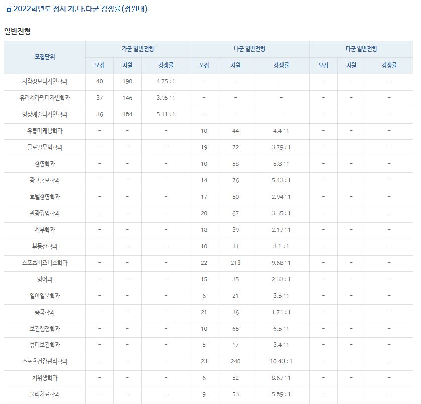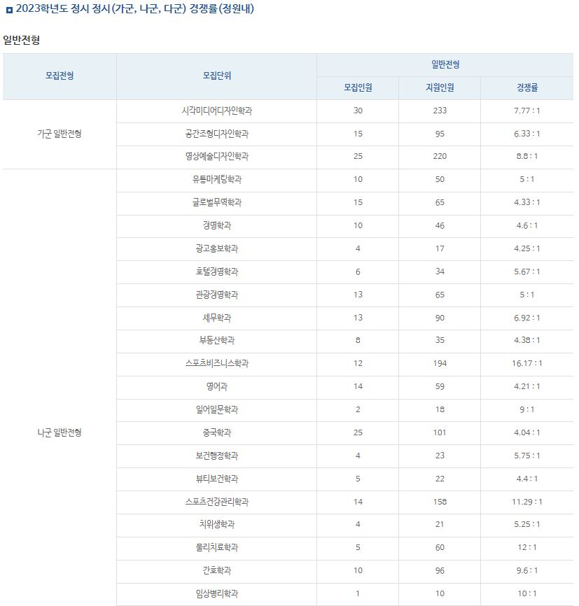 가장 경쟁률이 높았던 학과는 스포츠건강관리학과(10.43:1), 스포츠비즈니스학과(9.68:1), 치위생학과(8.67:1) 순이었습니다., 경영학과, 광고홍보학과, 호텔경영학과, 관광경영학과, 세무학과, 부동산학과, 스포츠비즈니스학과, 영어과, 일어일문학과, 중국학과, 보건행정학과, 뷰티보건학과, 스포츠건강관리학과, 치위생학과, 물리치료학과, 간호학과, 임상병리학과, 응급구조학과, 아동복지학과, 사회복지학과, 휴먼케어학과