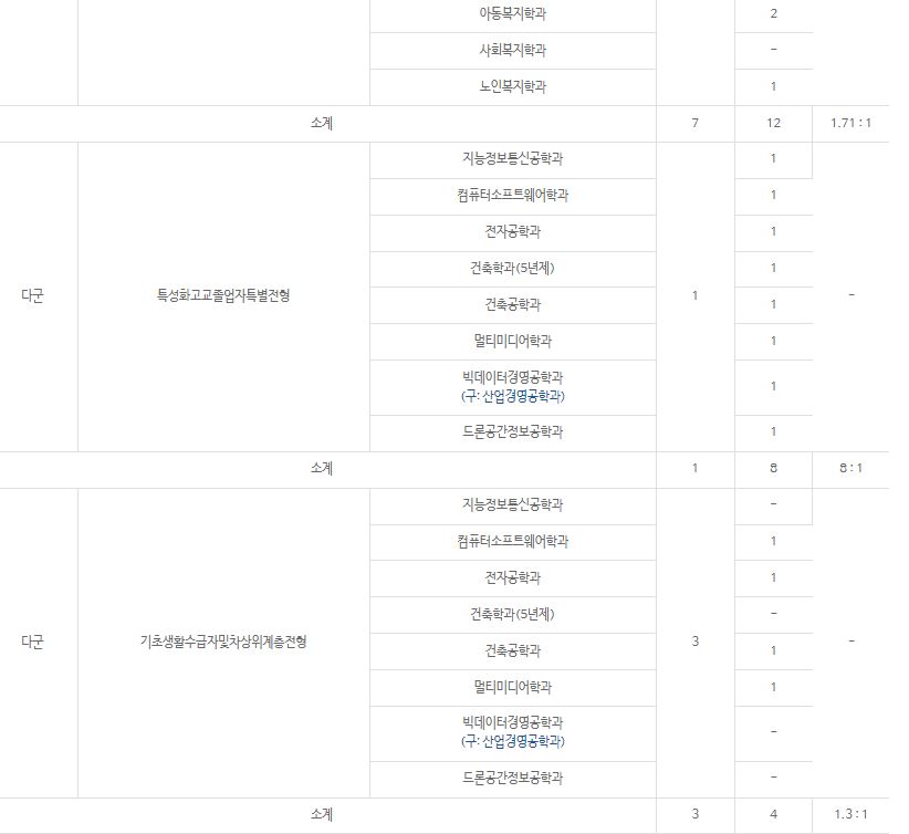 다군 : 가상현실학과, 지능정보통신공학과, 스마트팜학과, 컴퓨터소프트웨어학과, 전자공학과, 건축학과(5년제), 건축공학과, 멀티미디어학과, 빅데이터경영공학과, 드론공간정보공학과, 실용음악학과
