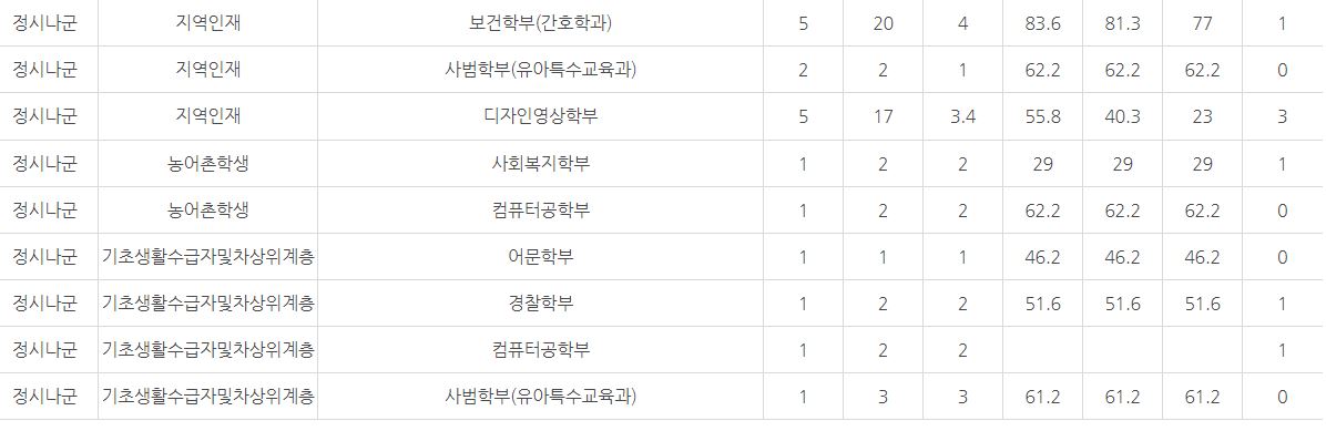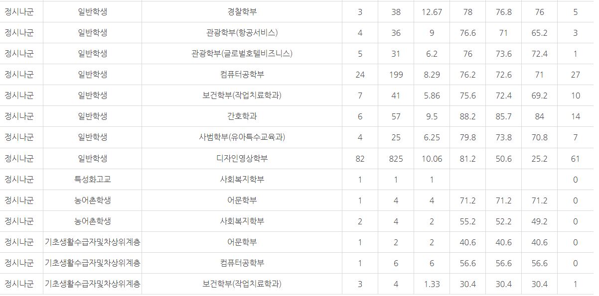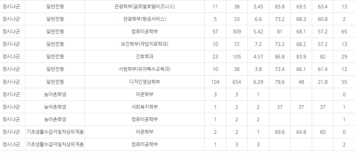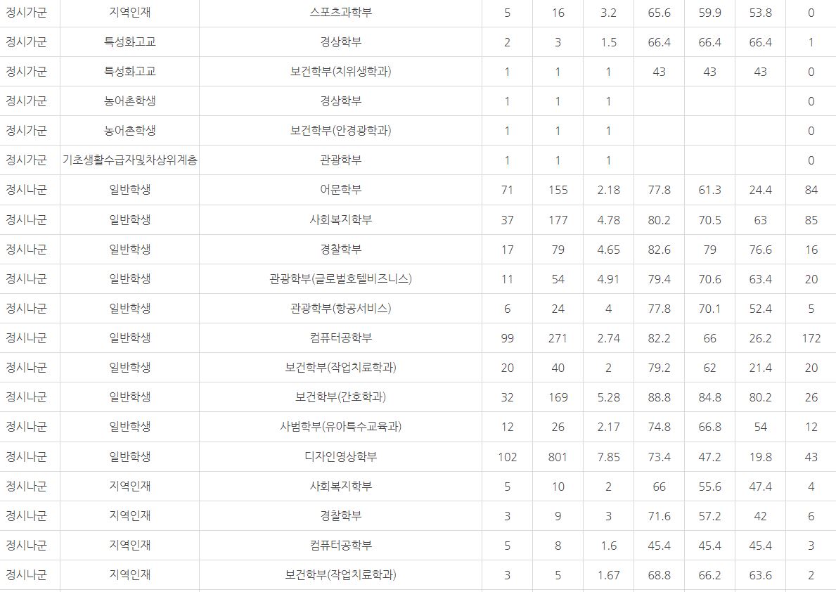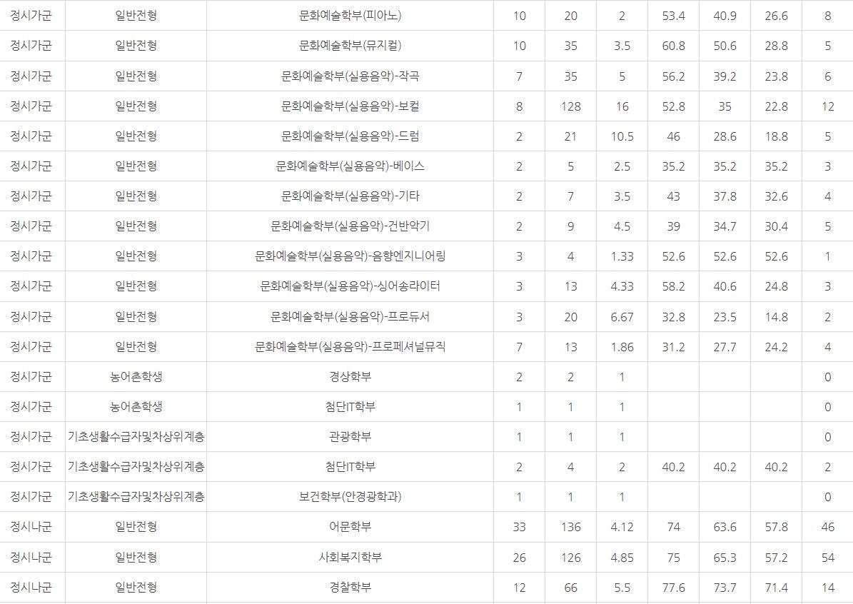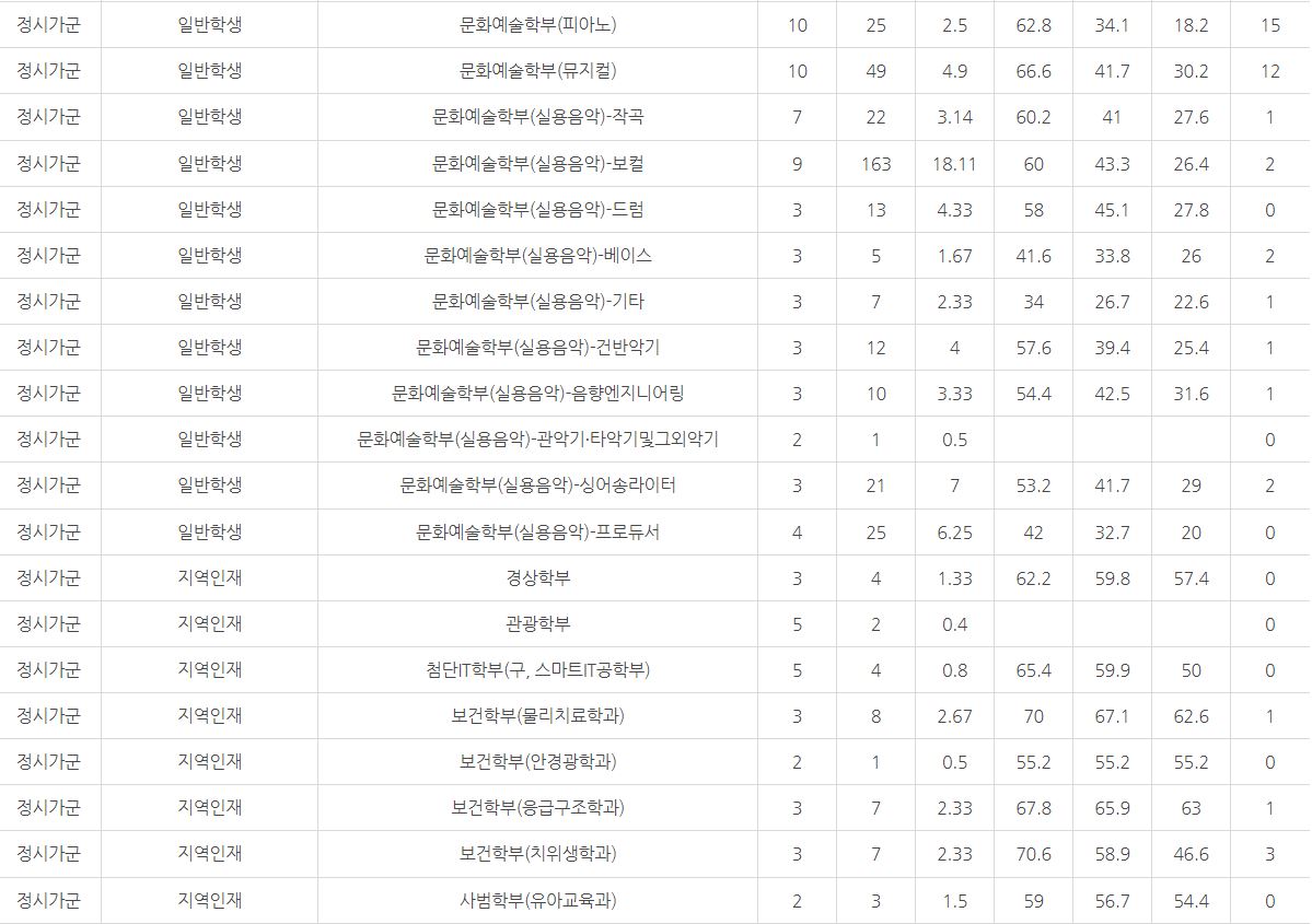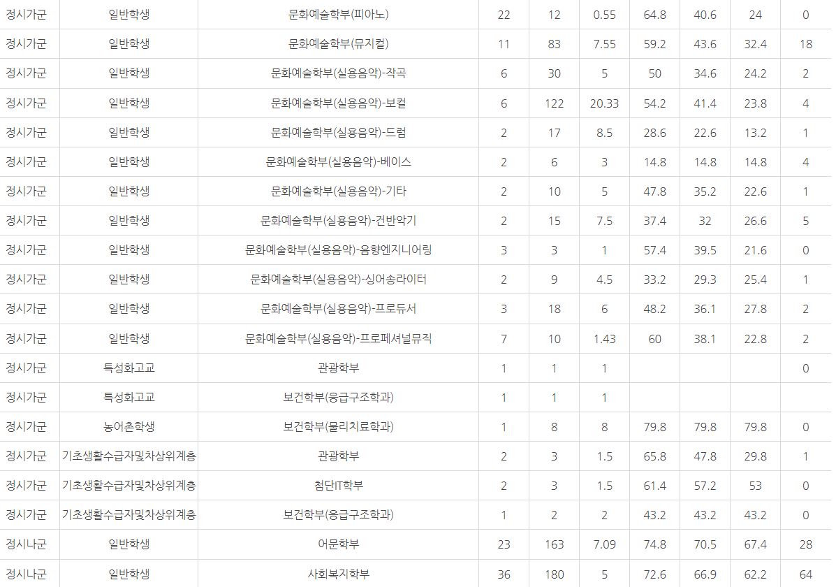작년 문화예술학부(피아노)는 미달이었으며, 이외의 학과 중 가장 경쟁률이 높았던 학과는 문화예술학부(실용음악)-보컬(20.33:1), 보건학부(물리치료학과)(14:1), 문화예술학부(연기예술)(13.5:1) 순이었습니다.