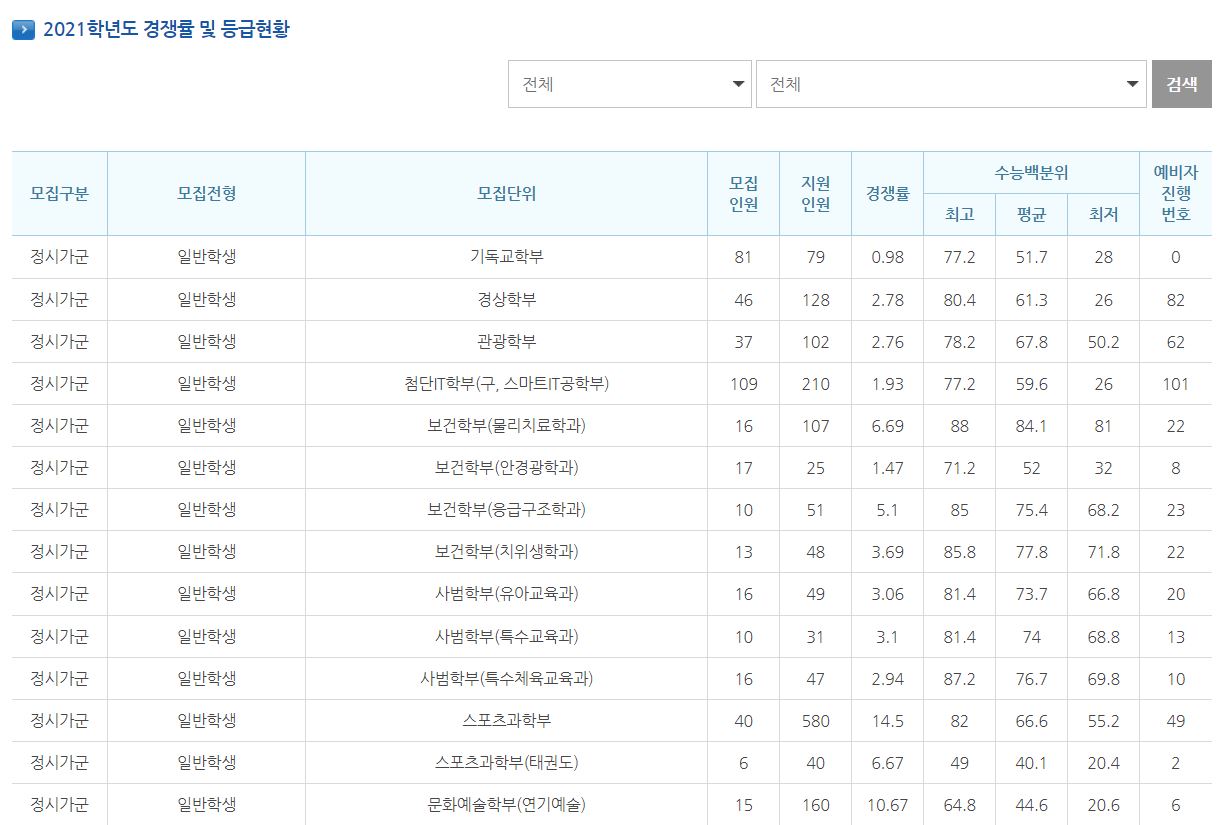 2021학년도 기독교학부, 관광학부(지역인재), 첨단IT학부(지역인재), 보건학부(안경광학과)는 미달이었으며, 이외의 학과 중 가장 경쟁률이 높았던 학과는 문화예술학부(실용음악)-보컬(18.11:1), 스포츠과학부(14.5:1), 문화예술학부(연기예술)(10.67:1) 순이었습니다.