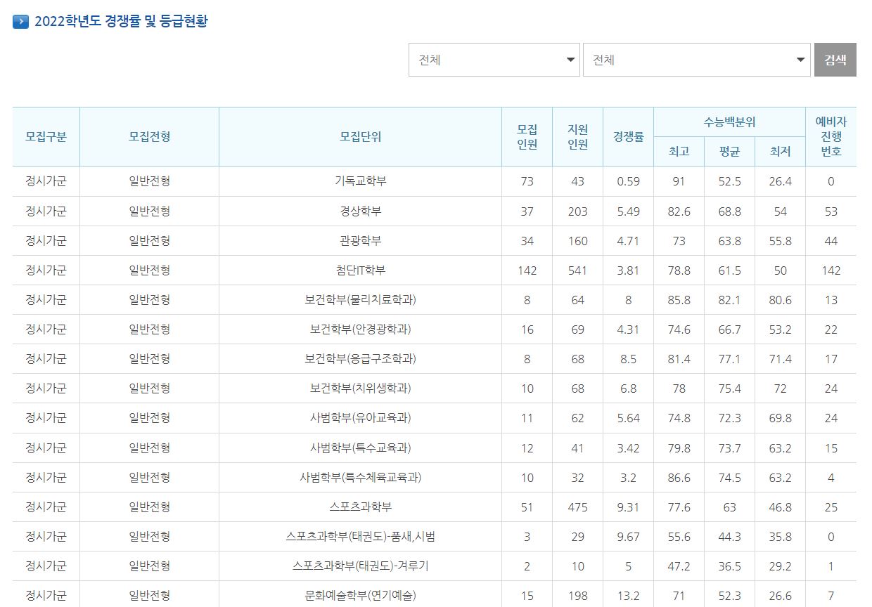 2022학년도 기독교학부는 미달이었으며, 이외의 학과 중 가장 경쟁률이 높았던 학과는 문화예술학부(실용음악)-보컬(16:1), 문화예술학부(연기예술)(13.2:1), 문화예술학부(실용음악)-드럼(10.5:1) 순이었습니다.