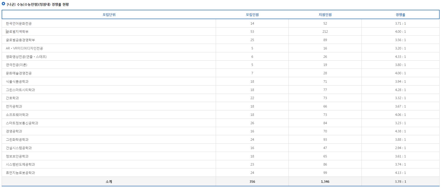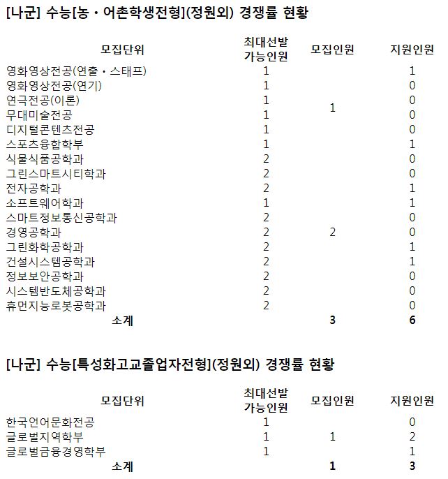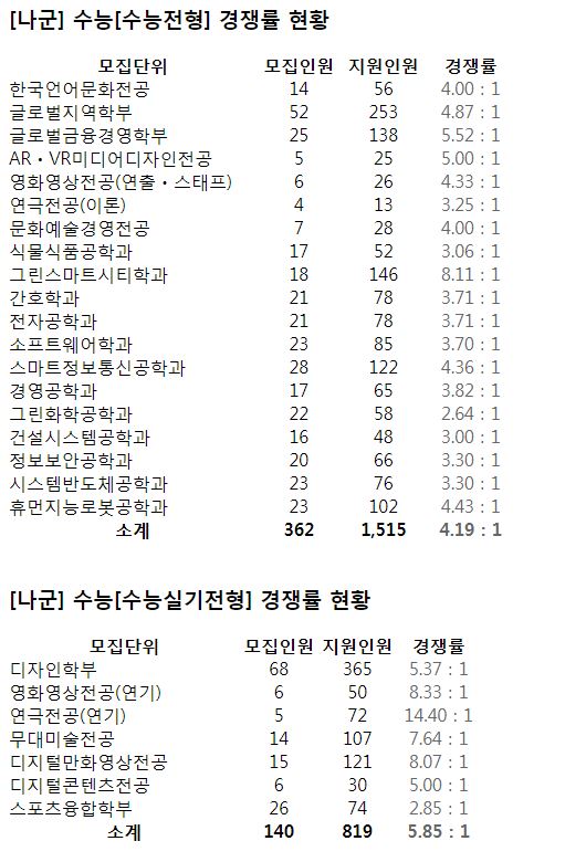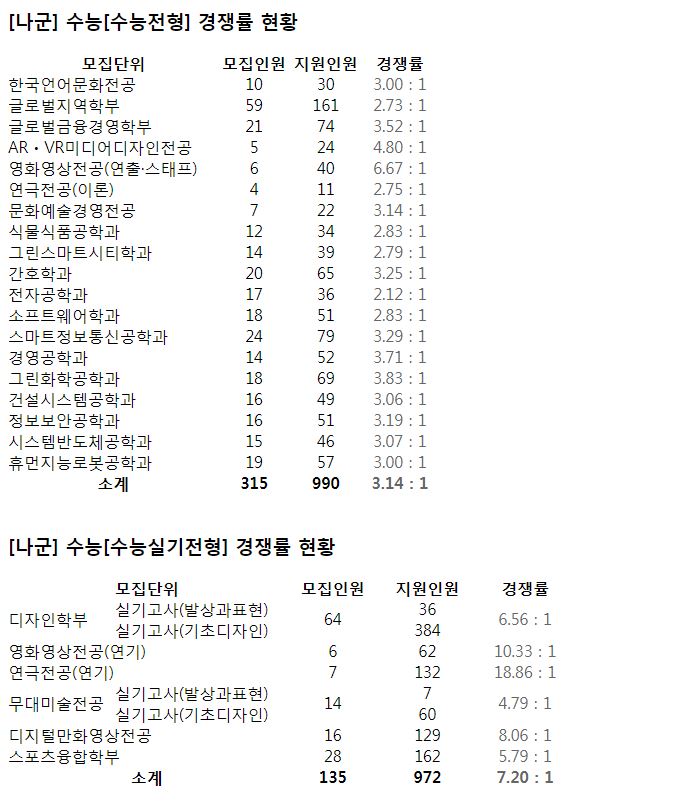 나군 : 한국언어문화전공, 글로벌지역학부, 글로벌금융경영학부, AR/VR미디어디자인전공, 영화영상전공(연출, 스태프), 연극전공(이론), 문화예술경영전공, 식물식품공학과, 그린스마트시티학과, 간호학과, 전자공학과, 소프트웨어학과, 스마트정보통신공학과, 경영공학과, 그린화학공학과, 건설시스템공학과, 정보보안공학과, 시스템반도체공학과, 휴먼지능로봇공학과, 디자인학부, 영화영상전공(연기), 연극전공(연기), 무대미술전공, 디지털만화영상전공, 디지털콘텐츠전공, 스포츠융합학부
