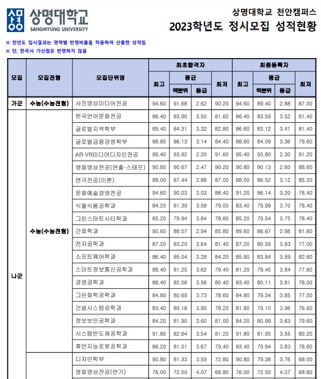 오늘은 상명대학교 천안캠퍼스의 3개년 정시 등급에 대해 포스팅해보도록 하겠습니다.