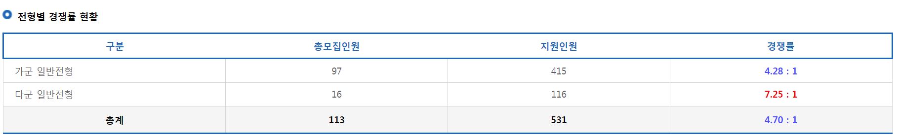 전형별 경쟁률을 살펴보자면, 가군 일반전형의 경쟁률은 4.28:1, 다군 일반전형의 경쟁률은 7.25:1 이었습니다.