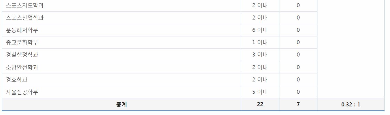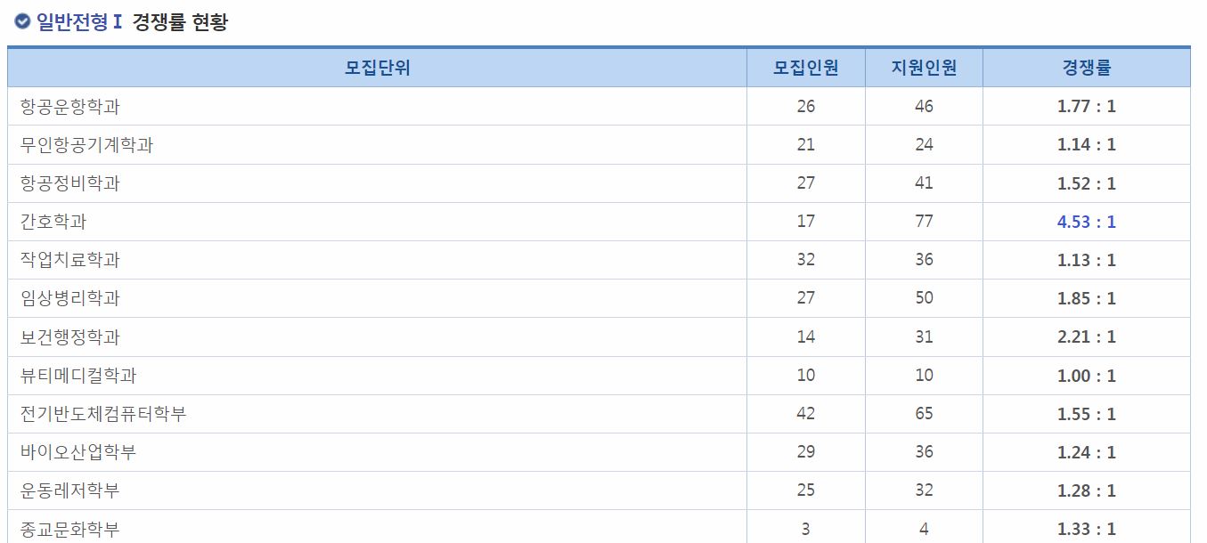 일반전형1의 소방안전학과는 미달이었으며, 뷰티메디컬학과, 경호학과의 모집인원과 지원인원은 같았습니다. 이외의 학과 중 가장 경쟁률이 높았던 학과는 간호학과(4.53:1), 보건행정학과(2.21:1), 자율전공학부(2.16:1) 순이었습니다.