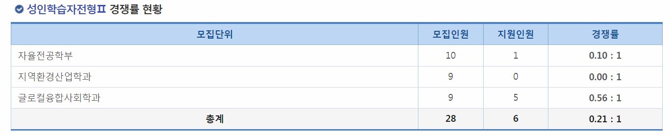 성인학습자전형2에서는 자율전공학부, 지역환경산업학과, 글로컬융합사회학과의 신입생을 모집했으며, 모두 미달이었습니다.