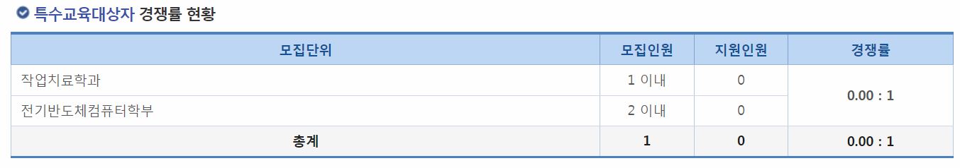 특수교육대상자에서는 작업치료학과, 전기반도체컴퓨터학부의 신입생을 모집했으며, 미달이었습니다.