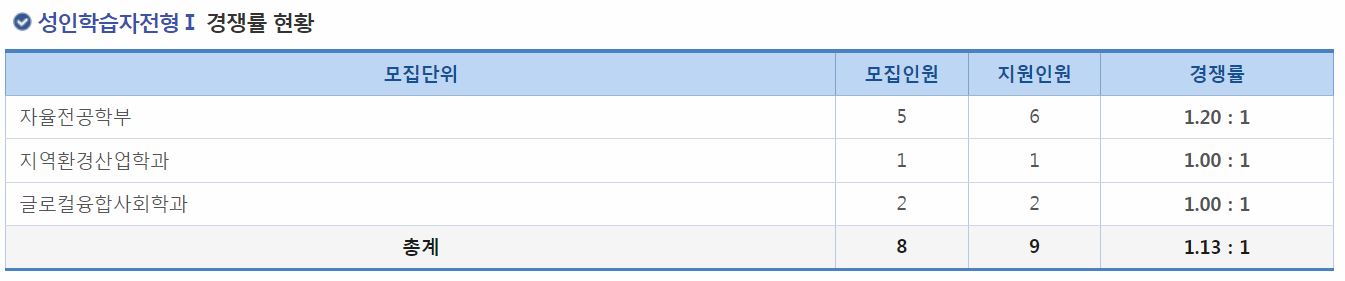 성인학습자전형1에서는 자율전공학부, 지역환경산업학과, 글로컬융합사회학과의 신입생을 모집했으며, 지역환경산업학과, 글로컬융합사회학과의 모집인원과 지원인원은 같았으며, 자율전공학부의 경쟁률은 1.20:1 이었습니다.