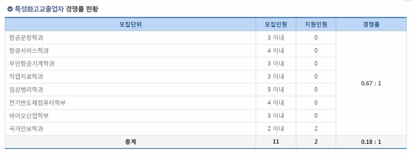 특성화고교졸업자 역시 학과를 통합하여 학생을 모집했으며, 미달이었습니다.